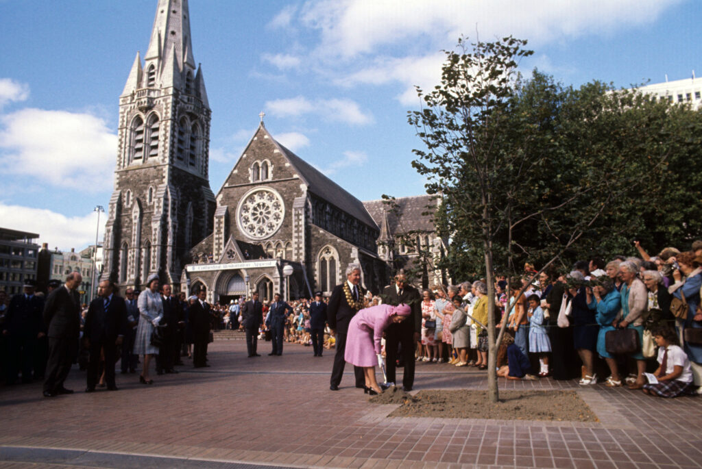 During Her Majesty's Silver Jubilee tour of New Zealand, The Queen plants a tree in Cathedral Square, Christchurch.